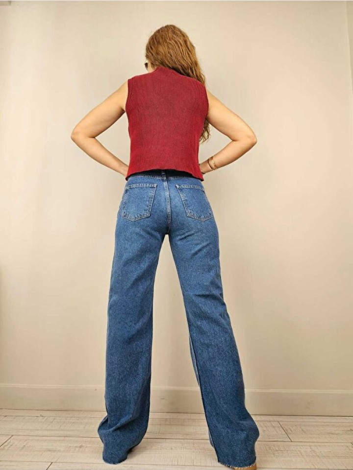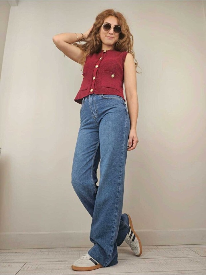YÜKSEK BEL, BEŞ CEPLİ, ÖNÜ METAL DÜĞMELİ VE FERMUARLI DÜZ KESİM, PAÇASI KESİK PANTOLON NORMAL KALIP