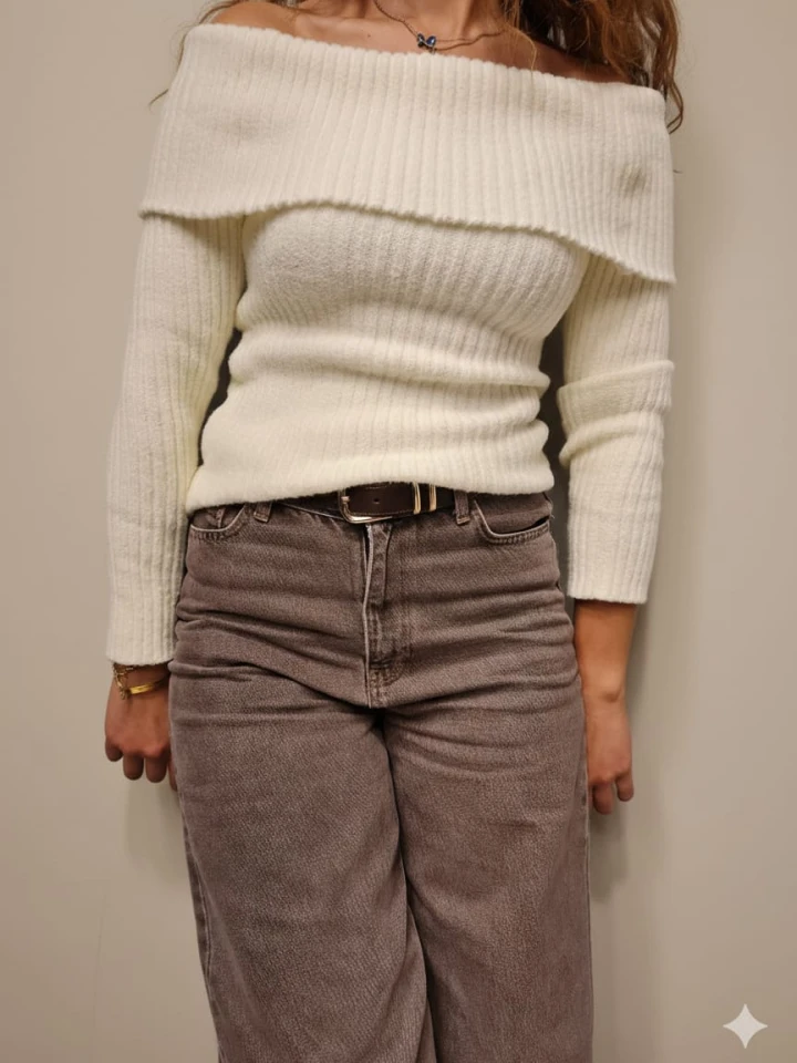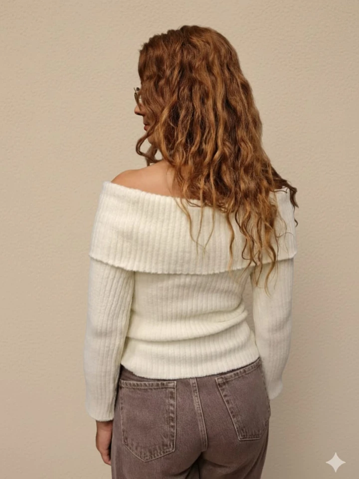 Omzu açık triko dokusuyla hem zarif hem sıcak bir görünüm 💫