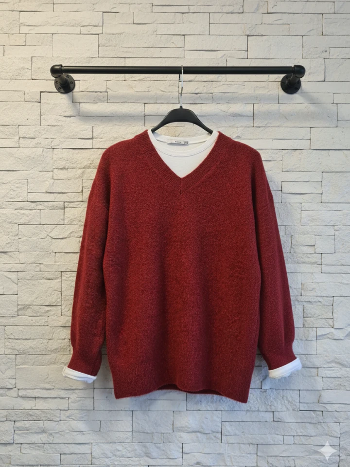 Oversize kesimi ve V yaka detayıyla, sade ama etkileyici bir duruş...
