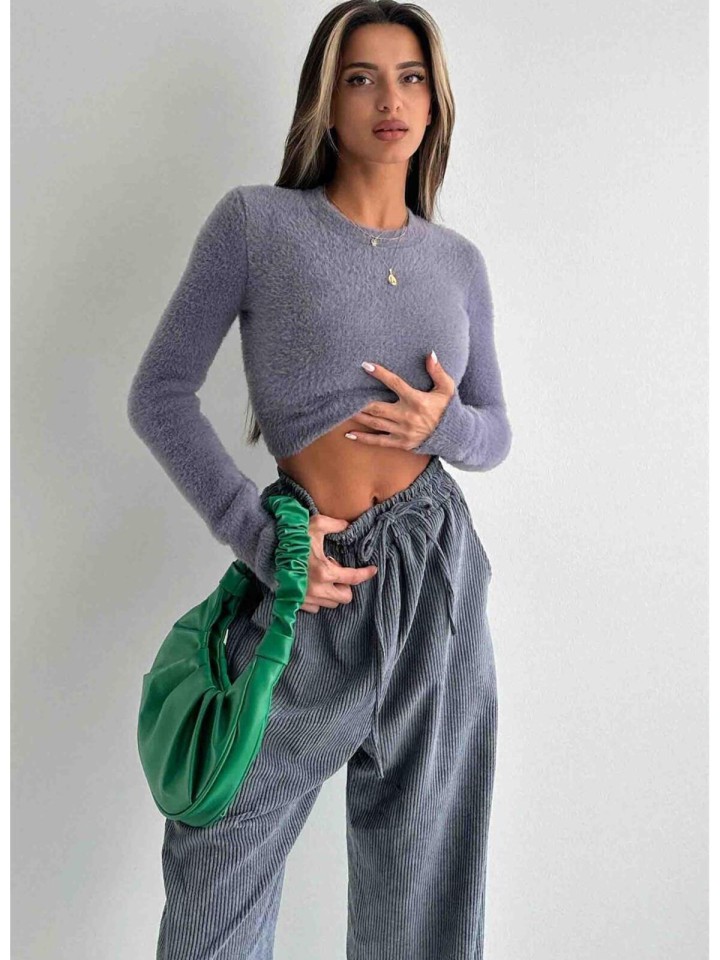 Her yaş grubuna hitap eden, rahat ve şık bir tasarım sunan bisiklet yaka sakallı crop kazak