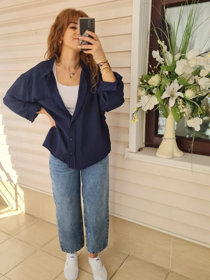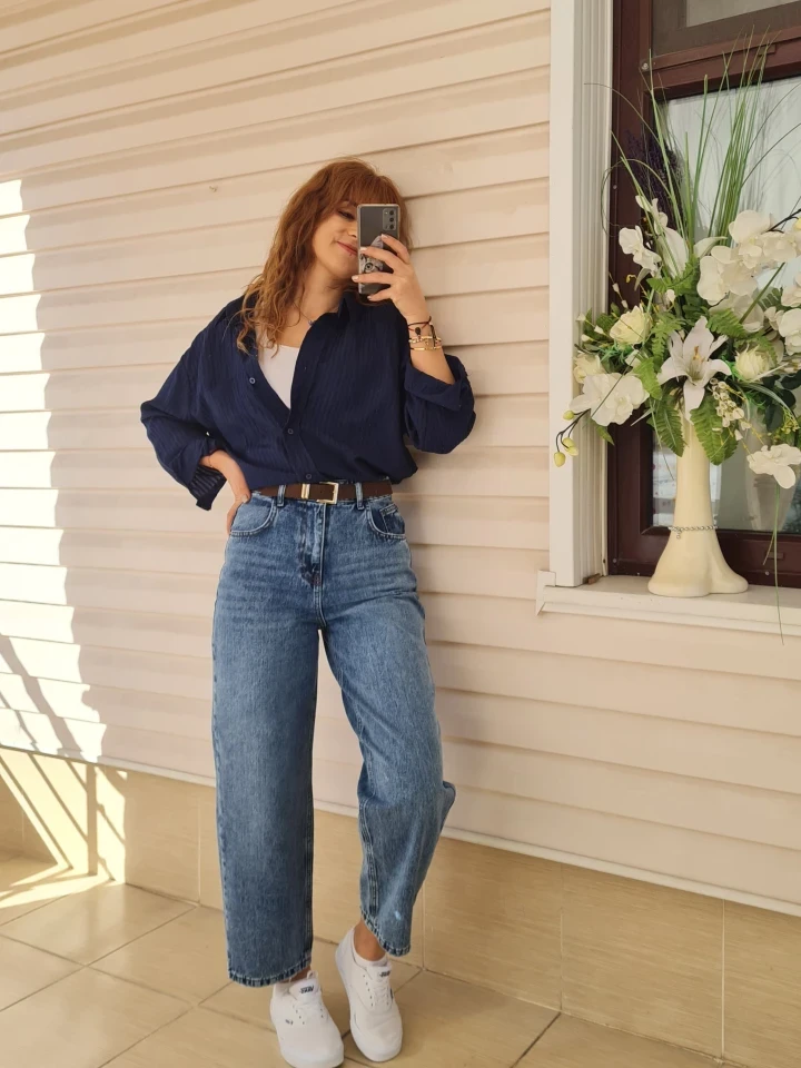 Günün stili hem rahat hem de iddialı olsun diyenler burada mı? Pastel tonlardaki çizgili oversize gömleğimizin hafif dokusu, vücut hatlarını kusursuz gösteren palazzo jean ile birleşti. İster hafta sonu kahvesinde, ister ofis şıklığında; bu kombinle tüm bakışlar üzerinde olacak! ✨