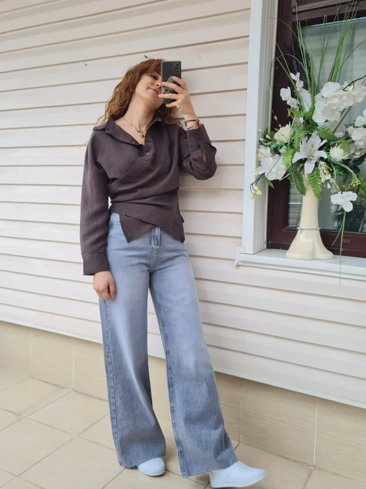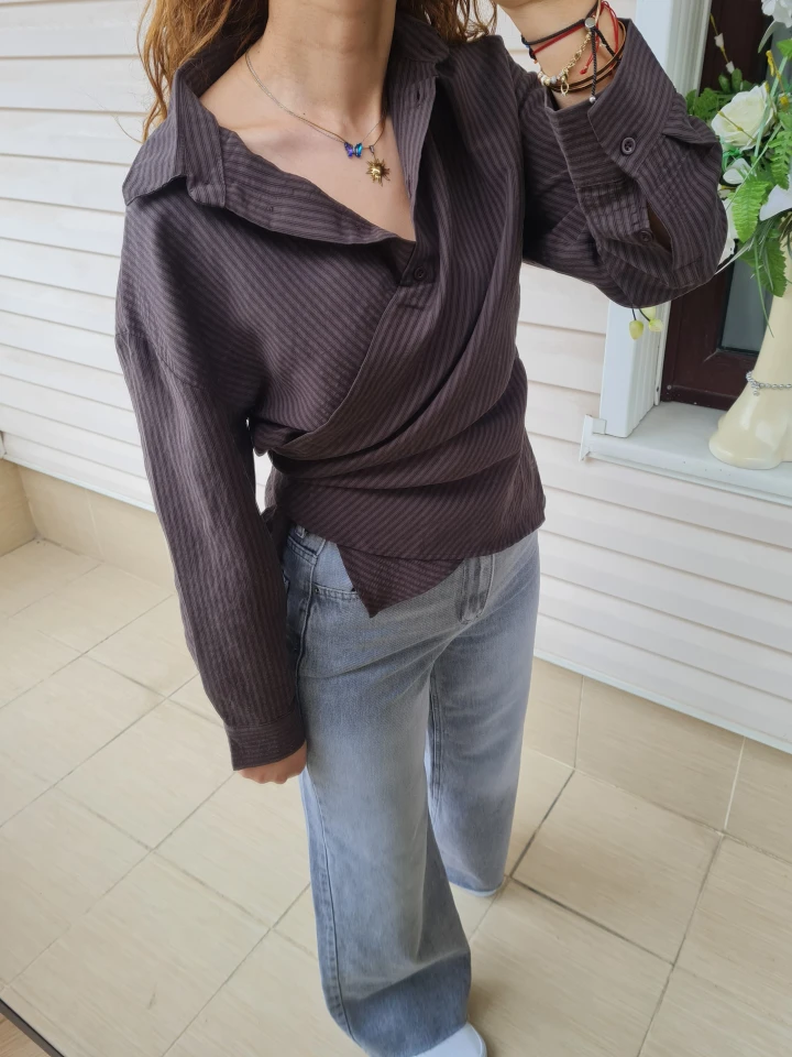 Kruvaze bağlamalı çizgili gömlek; bel detayıyla formunu ortaya çıkarır, çizgili yapısıyla zamansız bir şıklık sunar. Günlükten şık kombinlere kadar her anına uyum sağlar.