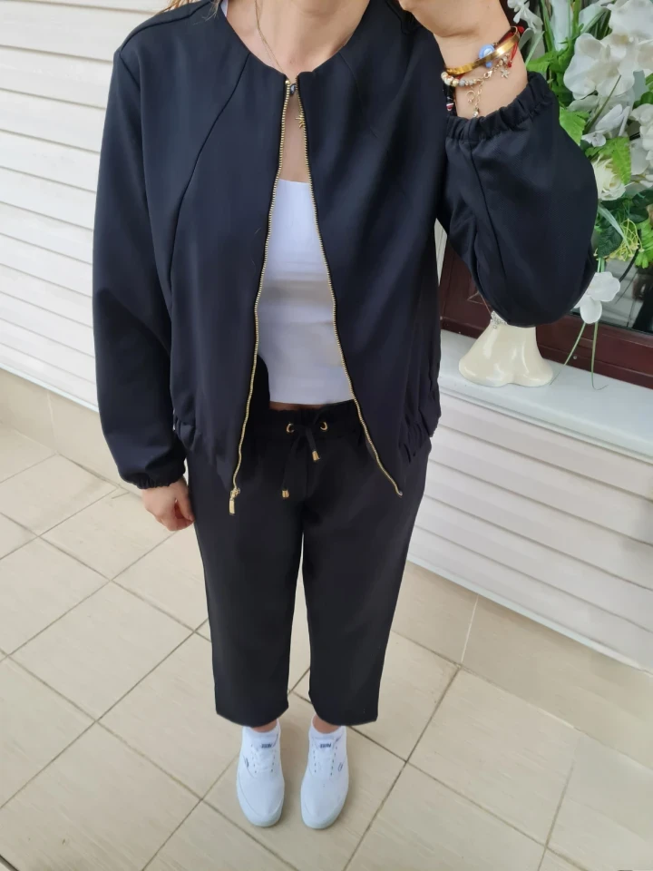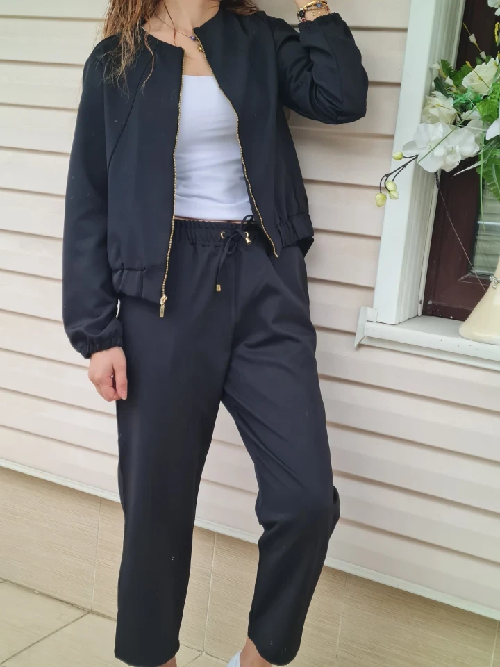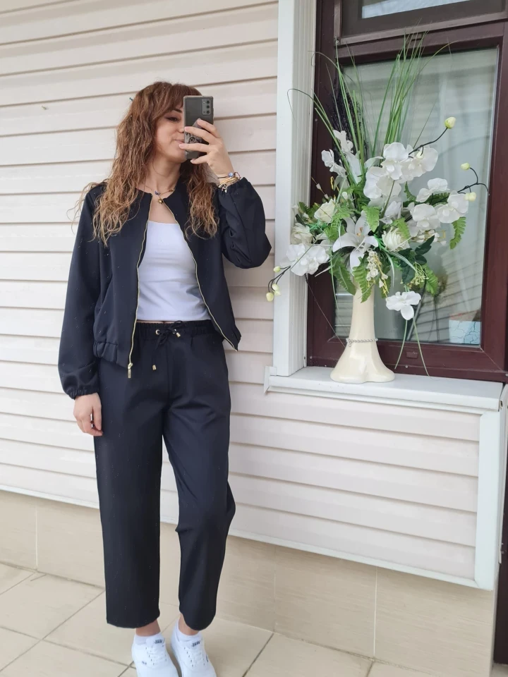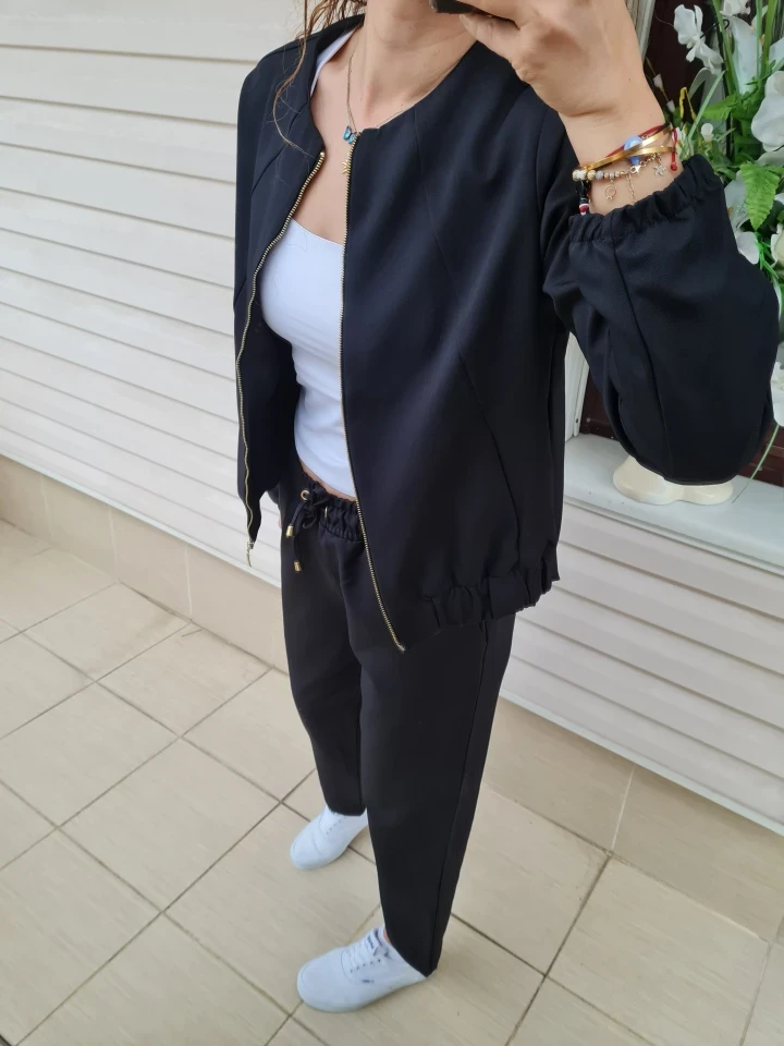 Fermuar detayıyla modern bir hava katan ceketimiz ve kusursuz kalıplı pantolonumuzla tanışın. Gardırobunuzun en joker parçası olmaya hazır mı?