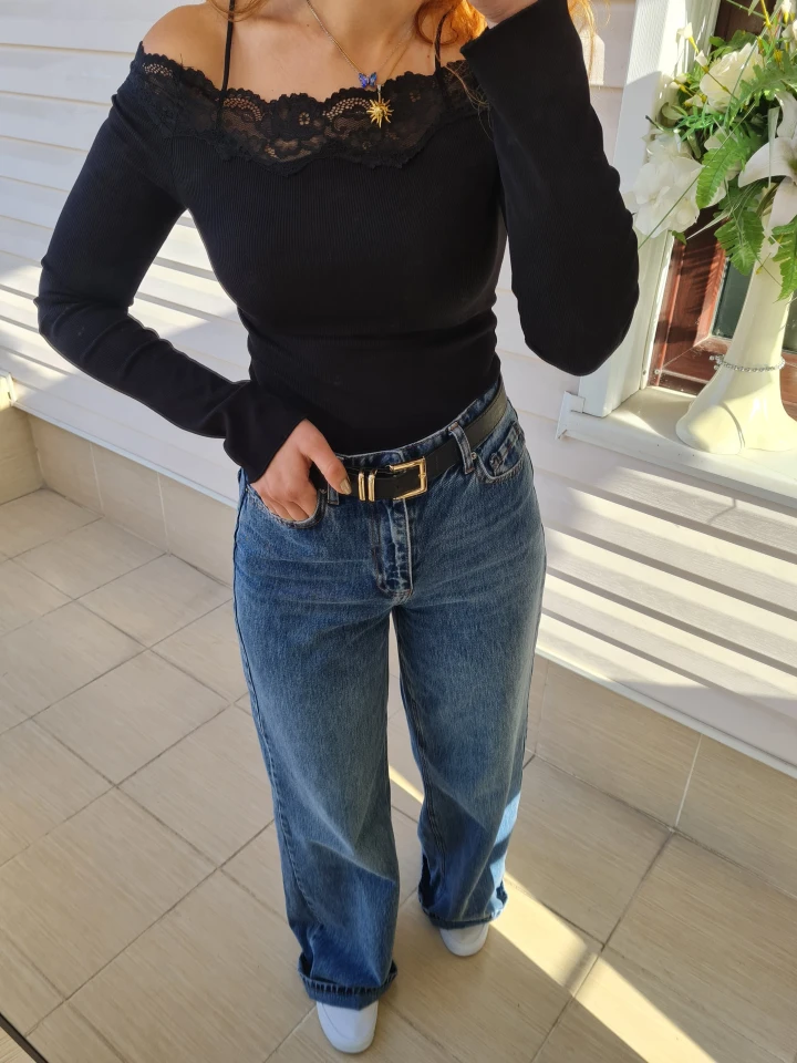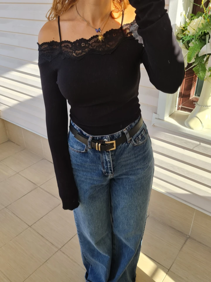 Omuzları ön plana çıkaran kayık yaka kesimi ve romantik dantel dokusu ile tek başına bile kombin yıldızı ✨