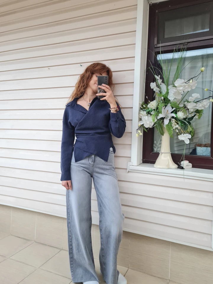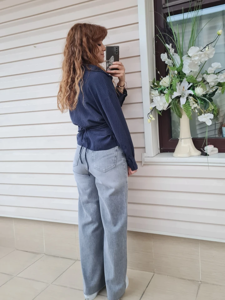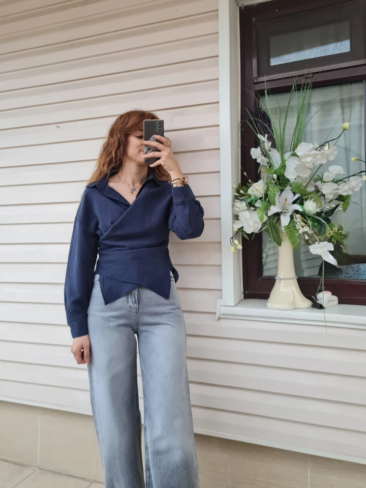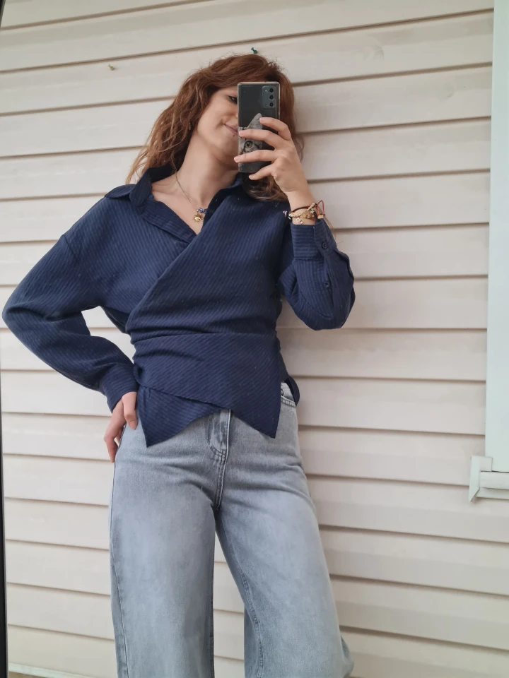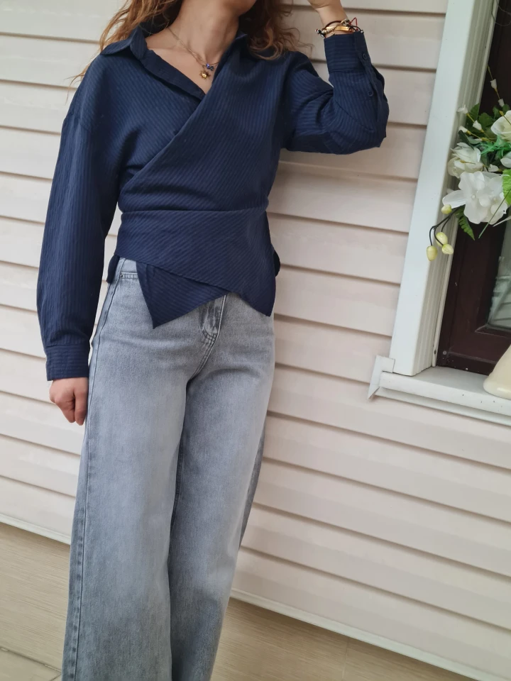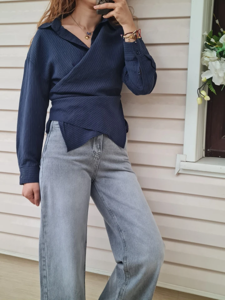 Kruvaze bağlamalı çizgili gömlek; bel detayıyla formunu ortaya çıkarır, çizgili yapısıyla zamansız bir şıklık sunar. Günlükten şık kombinlere kadar her anına uyum sağlar.