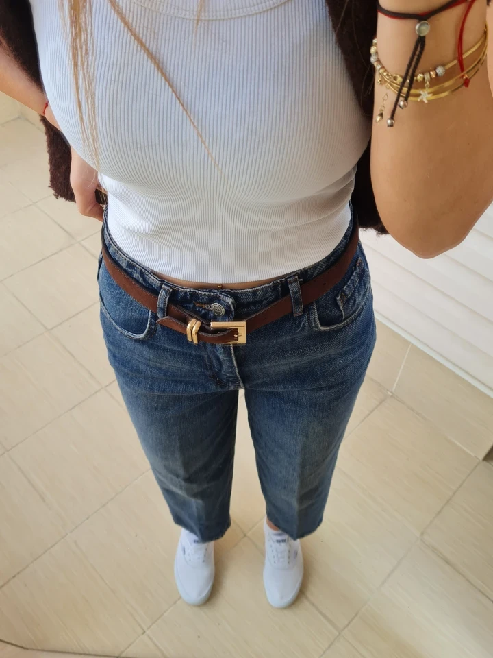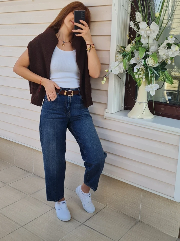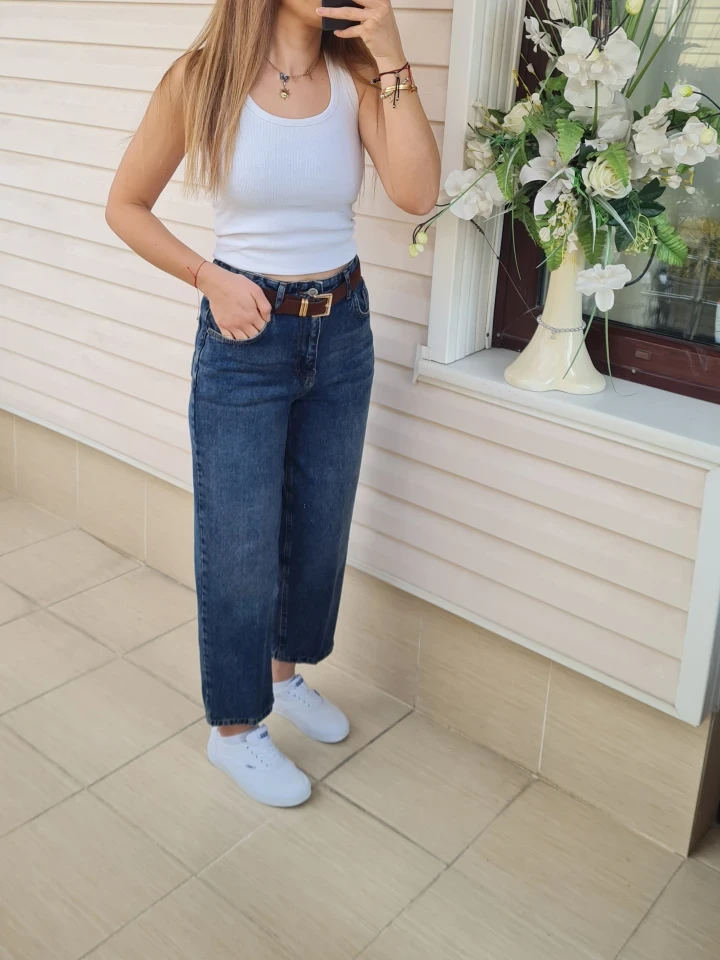 Süet kemer detayıyla tarzını bir adım öne taşıyan Mom Skater Jean, hem konforu hem de cool görünümü bir arada sunuyor