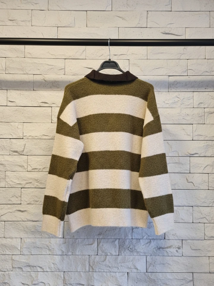 Yumuşacık dokusu, modern çizgili deseni ve dikkat çeken kırmızı yakasıyla hem günlük hem şık kombinler için ideal.